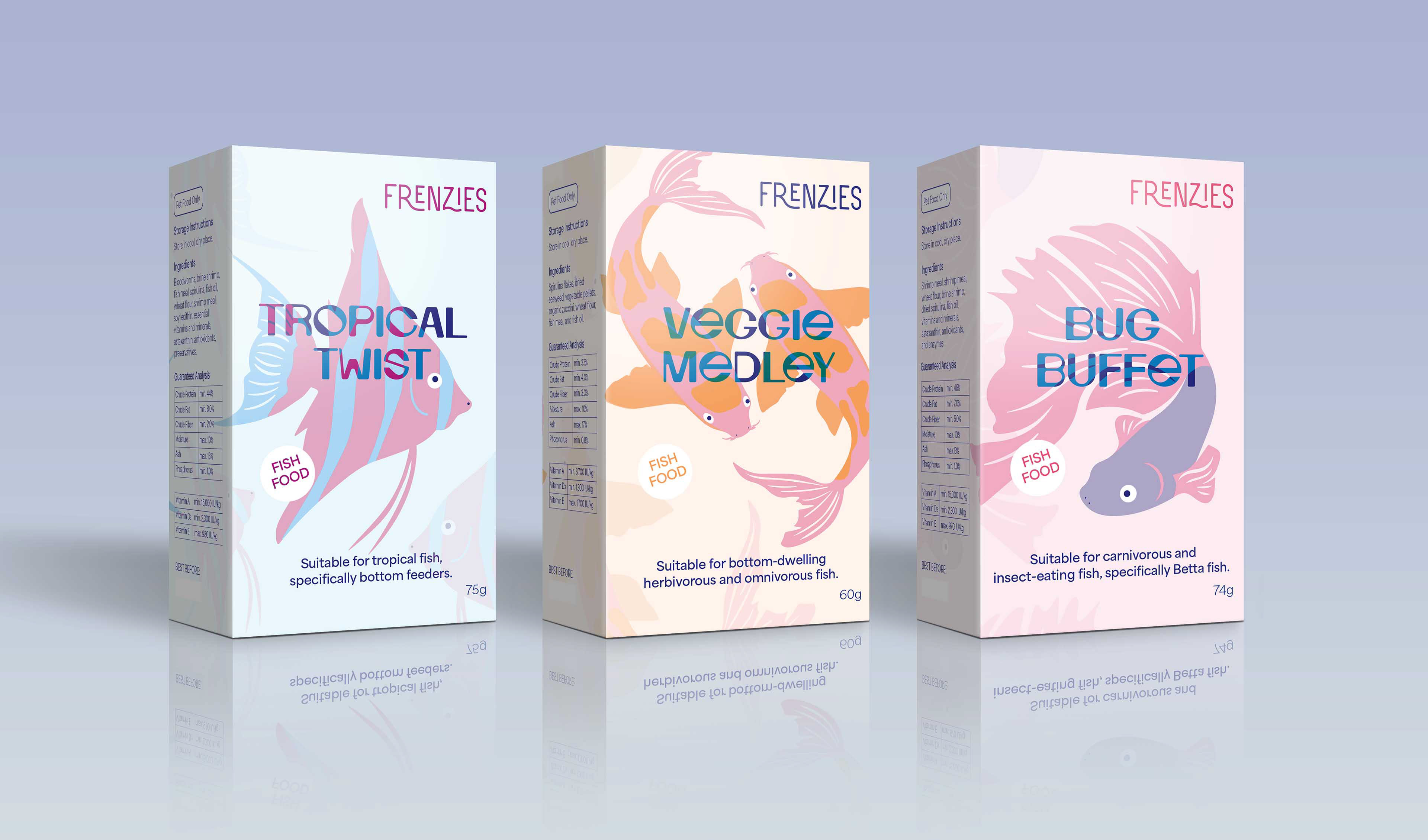 Frenzies is a boutique brand specialising in gourmet fish food, aiming to 'add a touch of culinary excellence to the diet of aquatic friends.' The packaging is designed to stand out from typical fish food with its cute, appealing graphics and soft colour palette, which is intended to have a feminine appeal. Each product variant uses a maximum of three colours per design and incorporates techniques such as overprint and knockout, as outlined in the design brief. To successfully achieve the overprint technique, thoughtful consideration was taken into the colour palette.